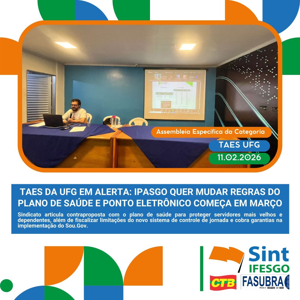 Assembleia Específica do Sint-IFESGO debate proposta do Ipasgo e alerta sobre riscos do ponto eletrônico na UFG. Servidores TAE da UFG se reuniram na tarde