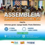 Sint-IFESGO convoca TAEs da UFG para Assembleia Específica nesta quarta (11/02), às 14h, sobre Ipasgo Saúde e ponto eletrônico. O Sint-IFESGO convoca a categoria TAE