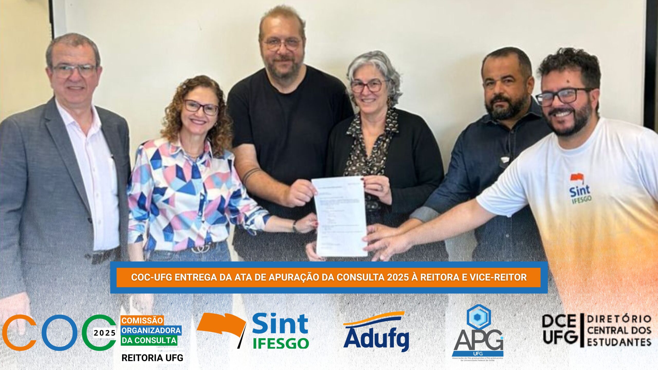 Estiveram presentes na entrega da ata: Fernando César Silva da Mota (presidente da COC-UFG), Geovana Reis (presidenta do Adufg-Sindicato), Diego Pereira Siqueira (coordenador-geral do Sint-IFESGO) e Flávio Alves da Silva (diretor financeiro do Adufg-Sindicato). O grupo foi recebido pela reitora da UFG, Angelita Pereira de Lima, e pelo vice-reitor, Jesiel Carvalho.