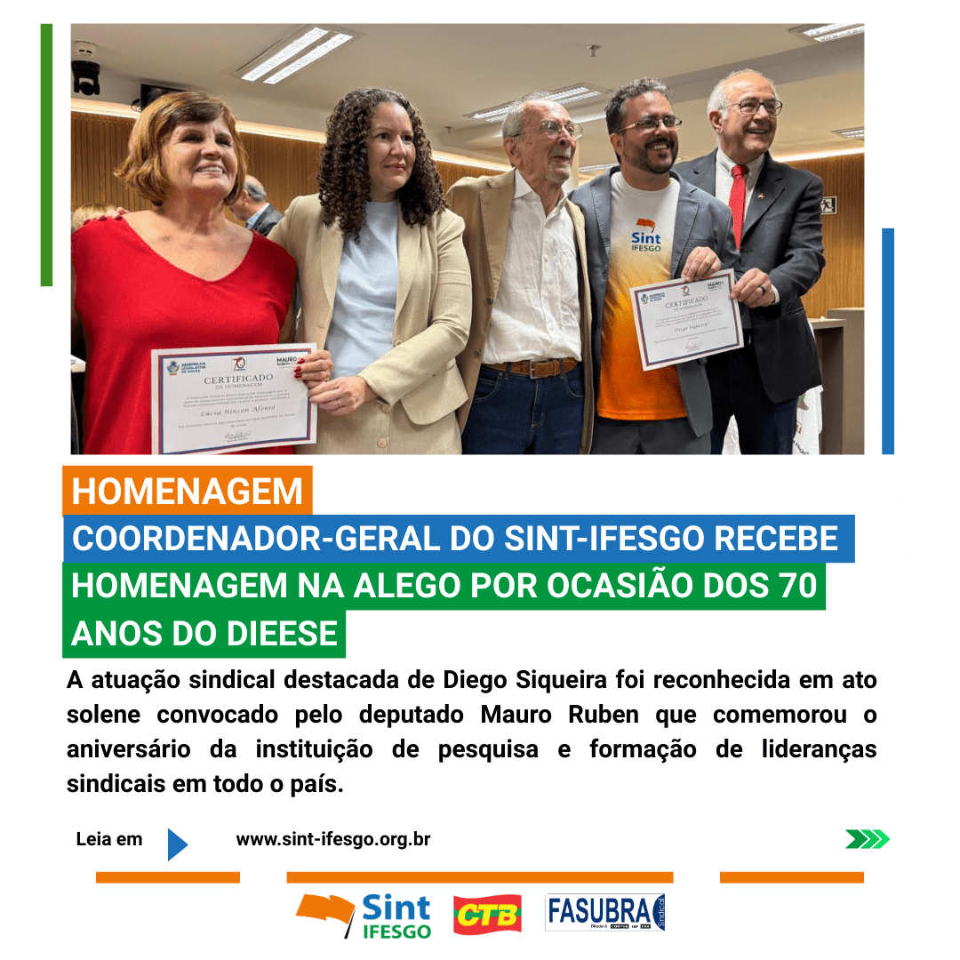 O SINT-IFESgo parabeniza Diego pela sua luta dedicada e seu firme compromisso com os TAEs e com toda a classe trabalhadora no estado de Goiás.