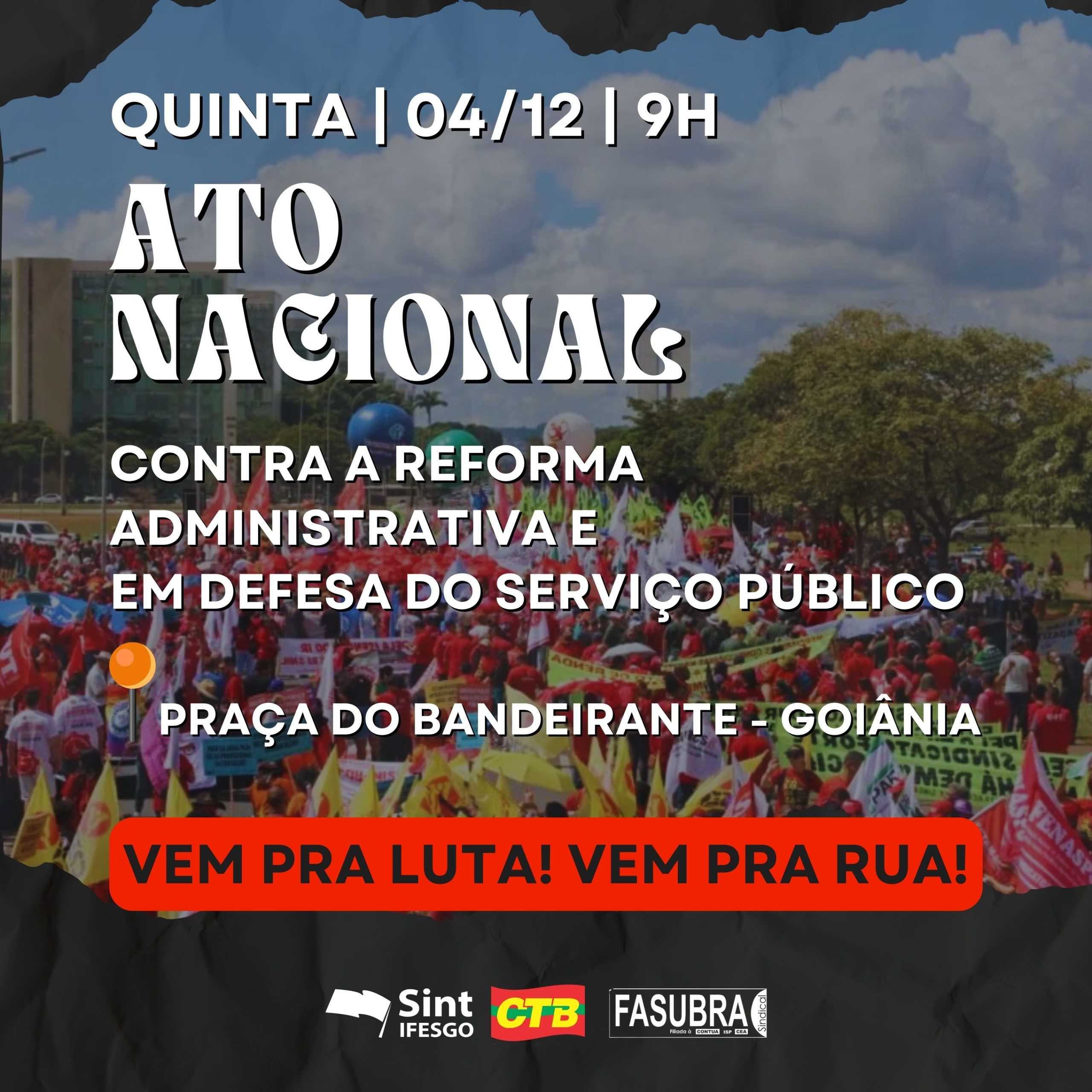 Nesta quinta-feira, 04 de dezembro, às 9 horas, o Sint-IFESGO, a CTB Goiás e o Fórum Goiano em Defesa dos Direitos, da Democracia e da Soberania realizam um ATO NACIONAL contra a Reforma Administrativa e em defesa do serviço público, na Praça do Bandeirante, em Goiânia. A mobilização integra a jornada de lutas em todo o país para barrar mais uma reforma que retira direitos, desmonta serviços e atinge diretamente a vida do povo brasileiro.