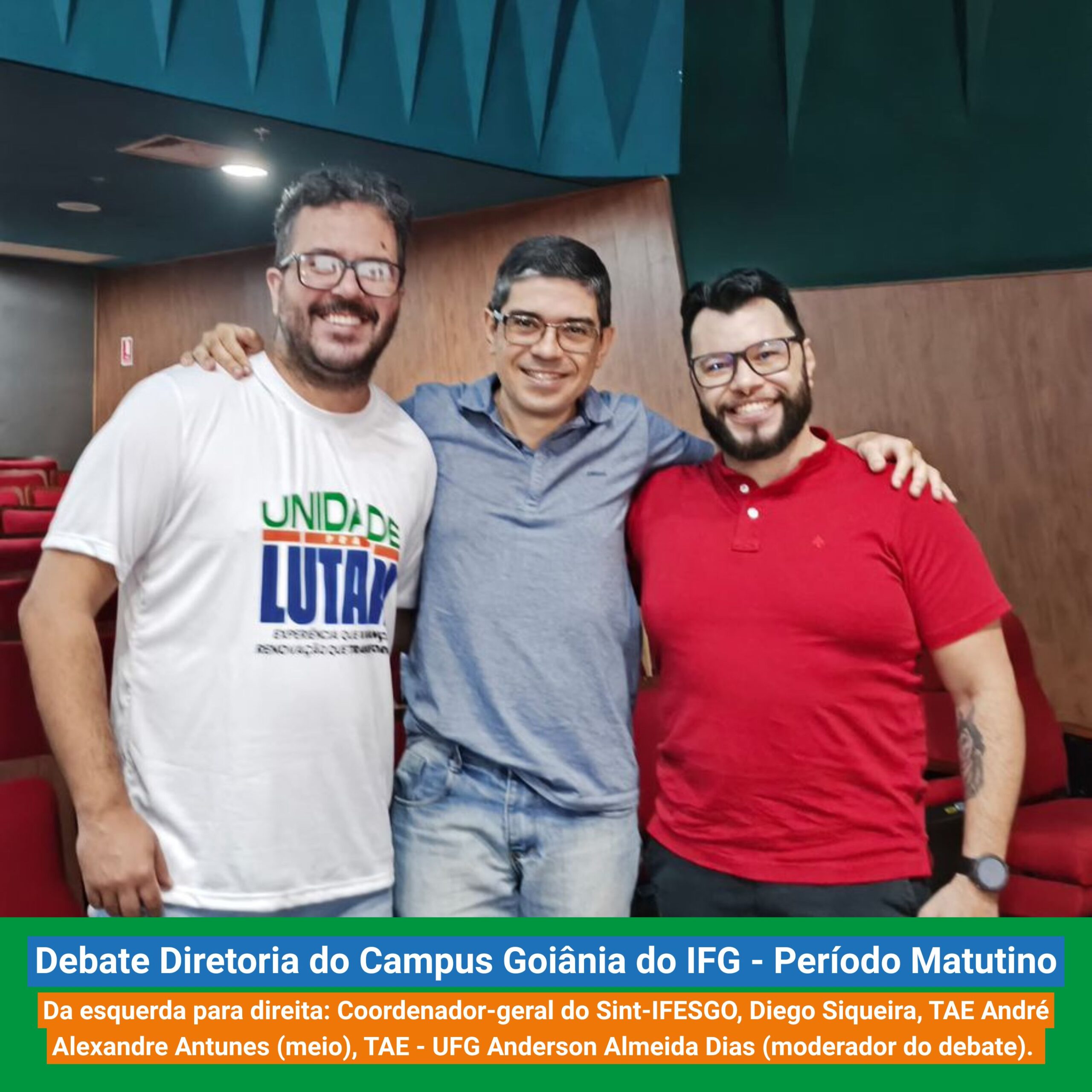 - Campus Goiânia (manhã): o técnico-administrativo Anderson Almeida Dias, da UFG, mediou o debate entre os candidatos Fabiane Costa Oliveira e Vinícius Carvalhaes. Realizado no teatro do campus, o evento seguiu o regramento oficial com quatro blocos temáticos e ampla participação da comunidade acadêmica.
