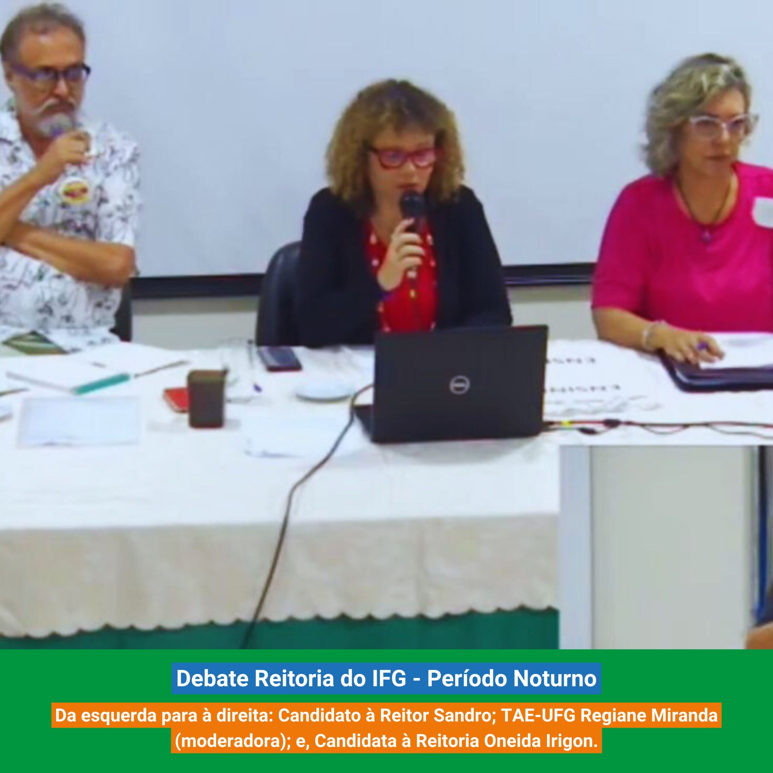 - Reitoria do IFG (noite): a servidora Regiane Miranda, TAE da UFG e também filiada ao sindicato, conduziu o debate entre os candidatos ao cargo de Reitor(a), promovido no auditório da Reitoria e transmitido ao vivo pelo canal do IFG no YouTube. O debate seguiu as normas definidas pela Comissão Eleitoral Central e garantiu igualdade de condições para todos os participantes.