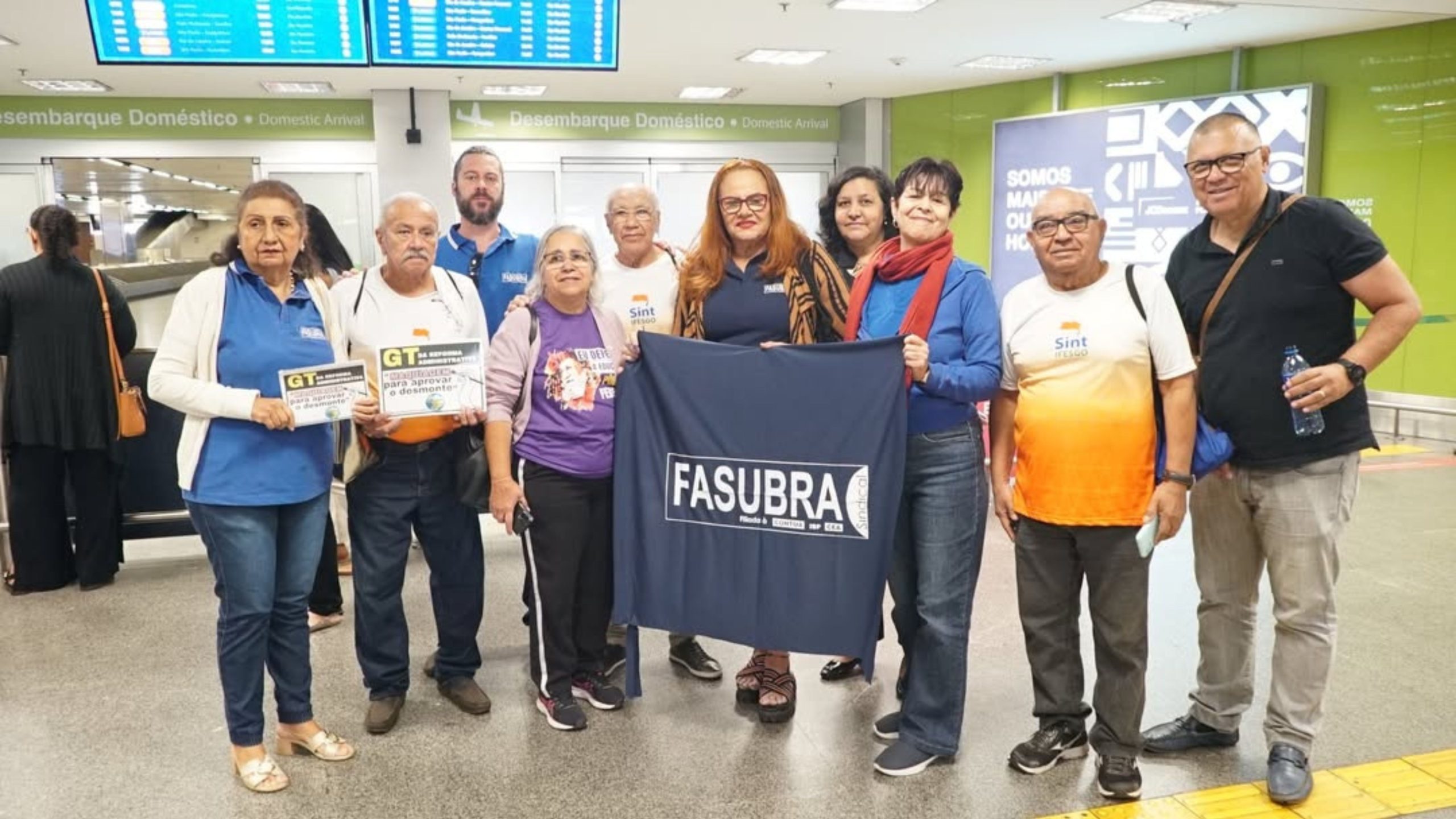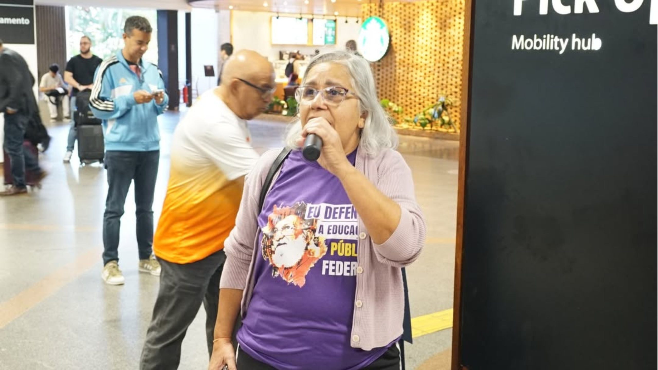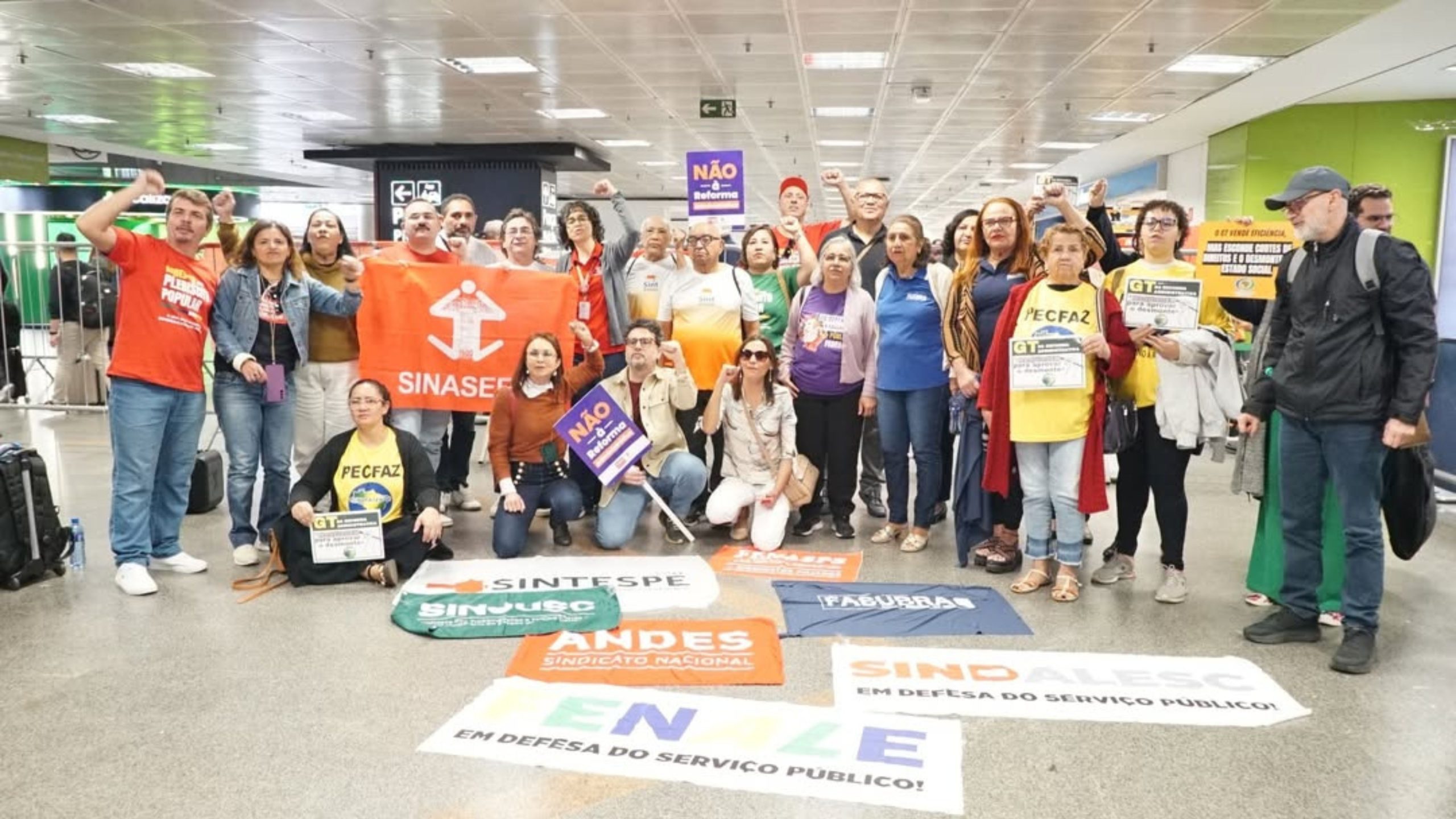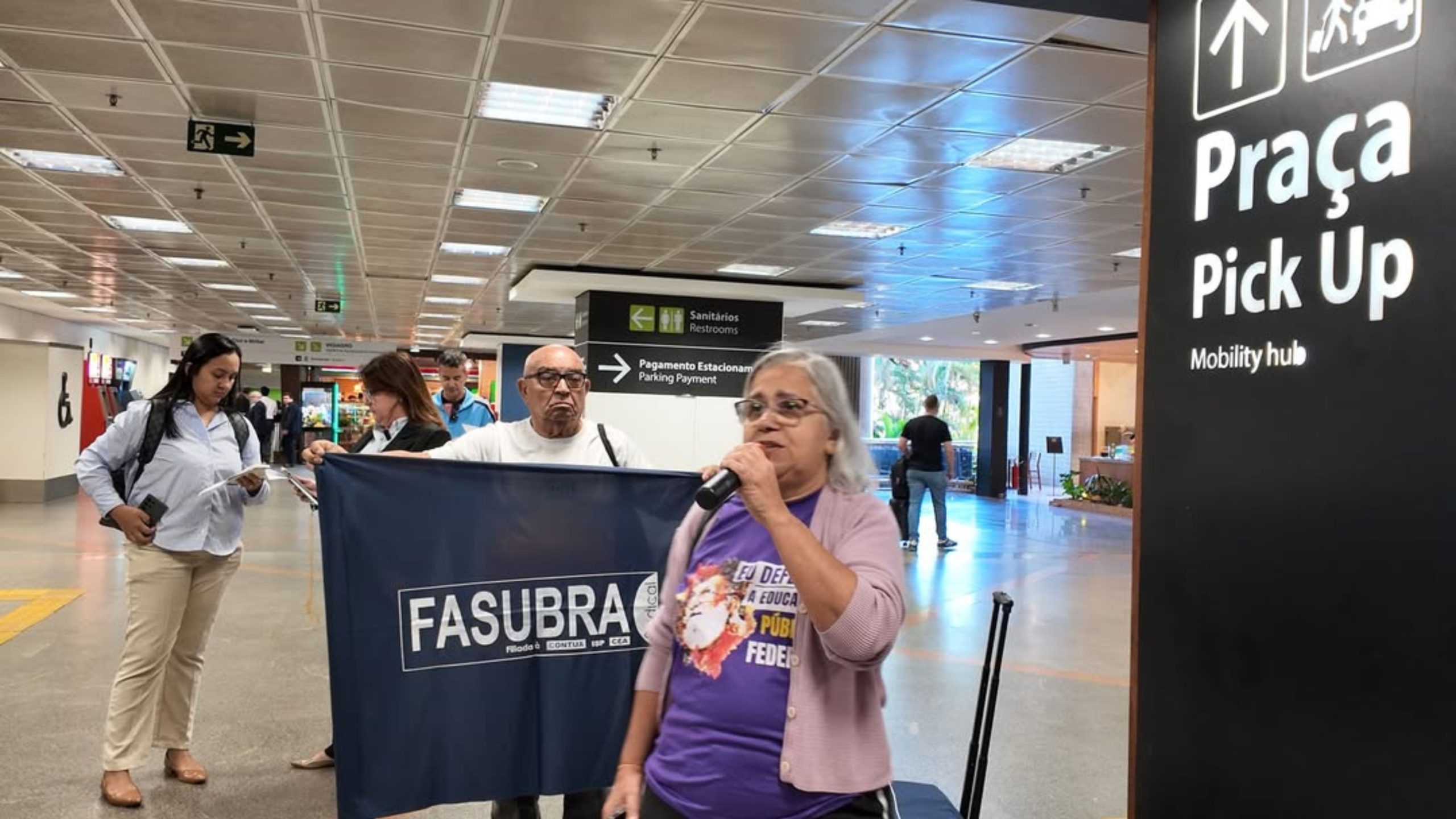A ação reuniu entidades nacionais, centrais sindicais e sindicatos — entre eles a FASUBRA Sindical — e levou ao saguão de desembarque o recado direto aos/às congressistas. Com faixas, cartazes e palavras de ordem, manifestantes destacaram que quem apoiar a Reforma Administrativa não terá apoio popular nas próximas eleições.