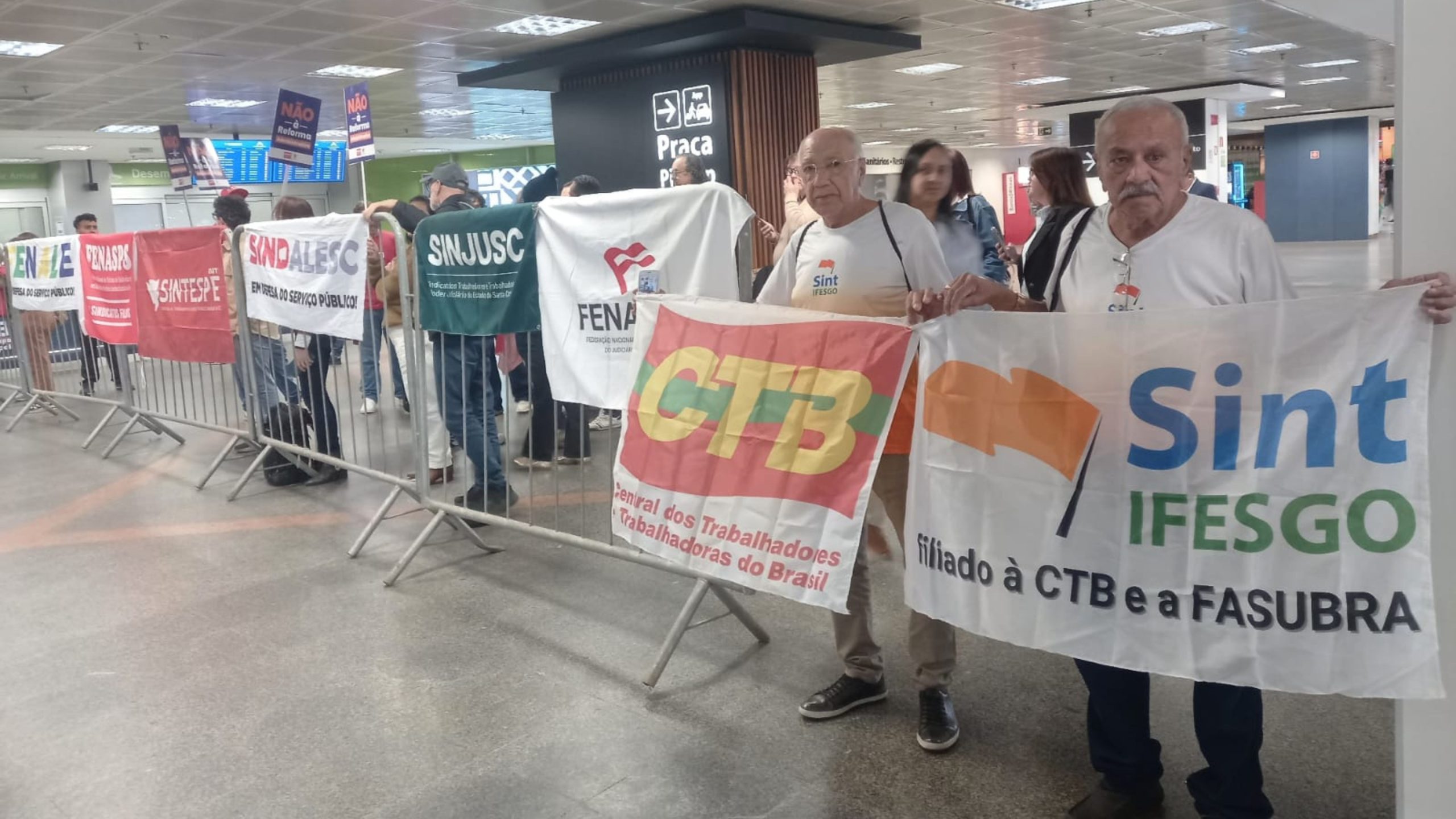 A Comissão do Sint-IFESGO, junto à CTB Goiás, participou na manhã desta terça-feira (12) da recepção a parlamentares no Aeroporto Internacional de Brasília, em ato convocado pelo FONASEFE. Com o mote “Quem votar, não volta!”, as entidades denunciaram que a Reforma Administrativa em tramitação na Câmara representa desmonte do serviço público e cobraram compromisso das/dos deputadas(os) com a população que depende dos serviços estatais.