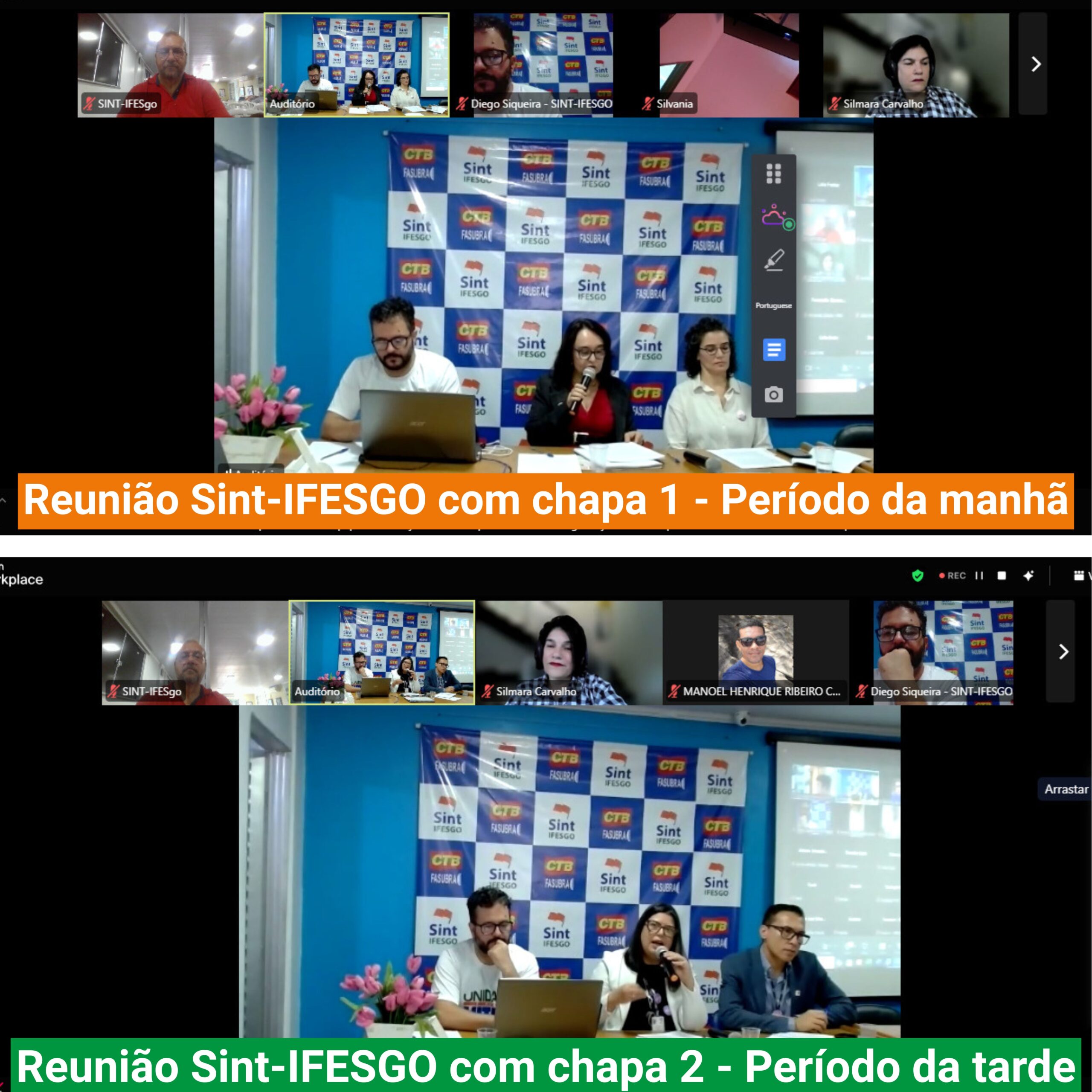 Servidoras e servidores TAE da UFG dialogam com candidatas em reuniões promovidas pelo Sint-IFESGO nesta segunda-feira (23). Sindicato apresenta protocolo de compromisso e ouve propostas das chapas 1 e 2 para as eleições à reitoria da UFG; temas como ponto eletrônico, saúde mental, valorização dos TAEs e fortalecimento do diálogo institucional foram debatidos.