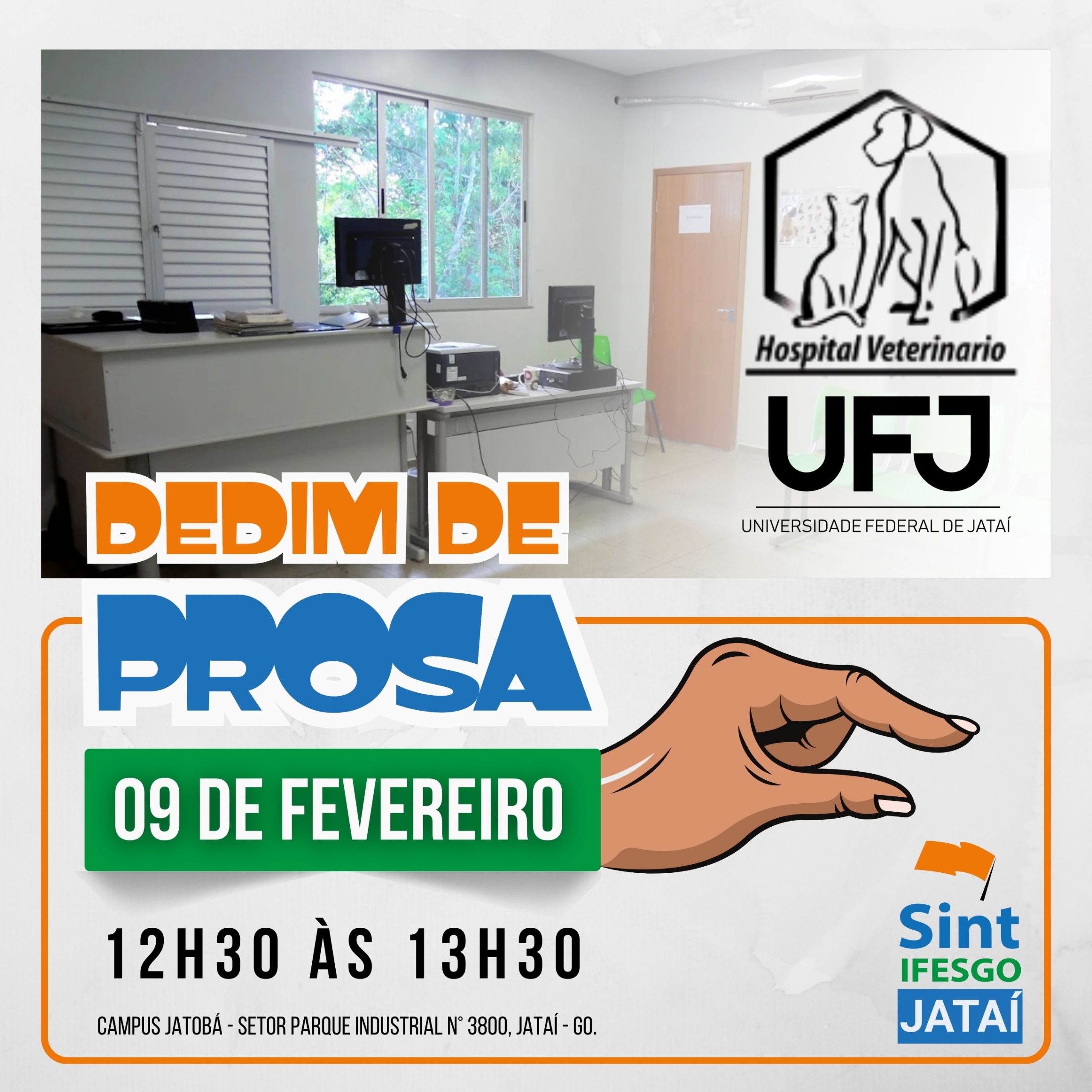O Sint-IFESGO – Regional Jataí realiza, na próxima segunda-feira, 09 de fevereiro, às 12h30, o primeiro encontro do ano do projeto “Dedim de Prosa”, voltado às(os) Técnicas(os)-Administrativas(os) em Educação (TAEs) que atuam no Hospital Veterinário da UFJ.