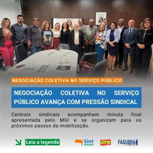 O debate sobre a regulamentação da negociação coletiva e do direito de greve no setor público deu um passo importante em reunião realizada entre o Ministério da Gestão e da Inovação em Serviços Públicos (MGI) e a bancada dos trabalhadores do Grupo de Trabalho da Negociação Coletiva no Setor Público. O encontro
