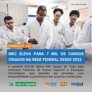 A portaria 252/26 libera 694 cargos de TAEs para Institutos Federais de Ensino Superior e Educação Tecnológica, que deverão ser providos com disponibilidade orçamentária das próprias instituições. O Ministério da Educação (MEC) autorizou por meio de portaria publicada na última quinta-feira, 19 de março, a liberação de 694 cargos Técnico-Administrativos em Educação