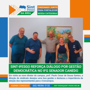 A direção do Sint-IFESGO realizou visita institucional ao novo diretor do IFG Campus Senador Canedo, prof. Paulo Cesar de Sousa Santos, com o objetivo de desejar uma gestão exitosa à frente da unidade e, ao mesmo tempo, reafirmar a importância do fortalecimento dos espaços democráticos no campus. Na ocasião, a direção sindical