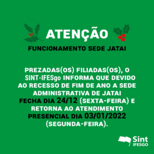 ATENÇÃO Prezadas(os) filiadas(os), o SINT-IFESgo informa que devido ao recesso de fim de ano a Sede Social do SINT-IFESgo fecha dia 23/12 (quinta-feira) e retorna as atividades ao público no dia 06/01/2022 (quinta-feira). No dia 04/01 o atendimento funcionará de forma REMOTA. SINT-IFESGO