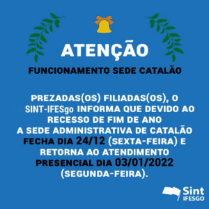 ATENÇÃO Prezadas(os) filiadas(os), o SINT-IFESgo informa que devido ao recesso de fim de ano a Sede Administrativa de Catalão fecha dia 24/12 (sexta-feira) e retorna ao atendimento presencial dia 03/01/2022 (segunda-feira). SINT-IFESGO