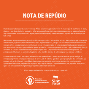 Diante da aprovação do uso da vacina Comirnaty (Pfizer) para imunização contra Covid-19 em crianças de 5 a 11 anos de idade, diretores e servidores da Anvisa passaram a sofrer ameaças de forma aberta e acintosa pelo exercício do seu dever funcional. Algo extremamente incompatível com o regime democrático e que