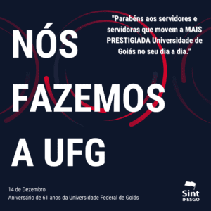O SINT-IFESgo parabeniza a Universidade Federal de Goiás em comemoração aos seus 61 anos de criação, e expressa os cumprimentos a todas servidoras e servidores públicos que durante esses anos se dedicam ao crescimento da instituição e contribuíram com o desenvolvimento de nossa sociedade. Temos profunda admiração por cada uma e