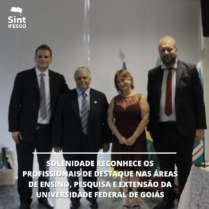 O SINT-IFESgo participou na manhã desta quinta-feira (16), da premiação de Reconhecimento do Conselho Universitário da Universidade Federal de Goiás (UFG). O evento foi realizado no Centro de Eventos da UFG e contou com a presença do Reitor, Edward Madureira, da Pró-Reitora da PROGRAD, Jaqueline Araújo, do Pró-Reitor Everton Wirbitzki (PROPESSOAS), dentre