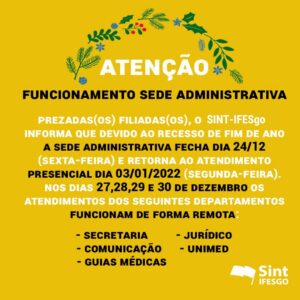 ATENÇÃO FUNCIONAMENTO SEDE ADMINISTRATIVA Prezadas(os) filiadas(os), o SINT-IFESgo informa que devido ao recesso de fim de ano a Sede Administrativa fecha dia 24/12 (sexta-feira) e retorna ao atendimento presencial dia 03/01/2022 (segunda-feira). Nos dias (27,28,29 e 30) os atendimentos dos seguintes departamentos funcionam de forma REMOTA: – Secretaria – Jurídico – Comunicação