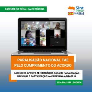 Em assembleia realizada nesta sexta pela manhã, servidoras e servidores reafirmam disposição de luta frente ao descumprimento do acordo de greve por parte do governo federal. Em Assembleia Geral da Categoria realizada na manhã desta sexta-feira (16), de forma híbrida — presencialmente na sede administrativa do Sint-IFESGO e também pelo aplicativo Zoom