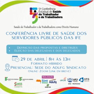 Está convocada a Conferência Livre de Saúde dos Servidores Públicos das Instituições Federais de Ensino em Goiás – Segundo Dia de debates! Vamos seguir debatendo a saúde dos(as) trabalhadores(as), as condições de trabalho nas IFE e contribuindo com os eixos da 5ª Conferência Nacional de Saúde das Trabalhadoras e dos Trabalhadores (CNSTT).