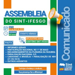 Data: 24 de abril de 2025 (quinta-feira) Horário: 16h Formato: Híbrido Presencial – Auditório da Sede Administrativa do Sint-IFESGO On-line – Aplicativo Zoom (O link será enviado nos grupos do sindicato no dia da Assembleia) O Sint-IFESGO convoca todas/os as/os trabalhadoras/es TAE para participarem da Assembleia Geral da Categoria, que será realizada