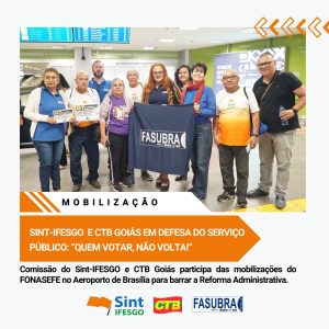 Comissão do Sint-IFESGO e CTB Goiás se soma às ações do FONASEFE no Aeroporto de Brasília e leva o recado “Quem votar, não volta!” a deputadas(os), em defesa do serviço público e contra o desmonte da Reforma Administrativa. A Comissão do Sint-IFESGO, junto à CTB Goiás, participou na manhã desta terça-feira (12)