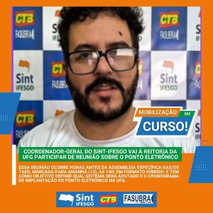 O coordenador-geral do Sint-Ifesgo, Diego Siqueira, participa hoje de reunião na Reitoria da Universidade Federal de Goiás (UFG) para tratar da implementação do ponto eletrônico na instituição. O encontro reúne representantes das categorias da comunidade acadêmica e tem como objetivo esclarecer qual sistema será adotado, de que forma será aplicado e em