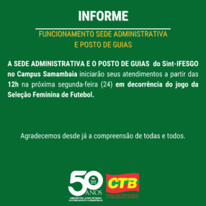 A Sede Administrativa Sint-IFESGO e o Posto de Guias do Campus Samambaia iniciarão seus atendimentos a partir das 12h na próxima segunda-feira (24) em decorrência do jogo da Seleção Feminina de Futebol. O Sint-IFESGO enfatiza a importância de valorizar o futebol feminino a fim de fomentar a prática e dar à
