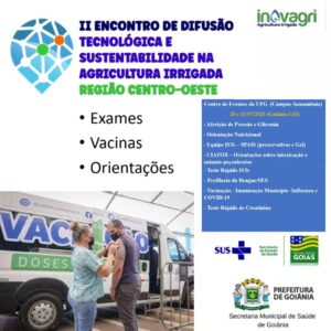 Acontecerá entre os dias 20 e 21/07 (Quarta e Quinta-Feira) o Encontro de Difusão Tecnológica e Sustentabilidade na Agricultura Irrigada da Região Centro-Oeste, no Centro de Eventos da UFG. O Evento voltado para debates e exposições ligadas à agronomia contará com uma tenda da saúde com diversos serviços oferecidos pelas Secretaria Estadual