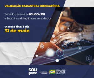Termina hoje, dia 31 de maio, o prazo para os agentes públicos federais atualizarem e validarem seus dados cadastrais junto à Administração Pública Federal. A validação dos dados pessoais e funcionais é obrigatória e deve ser realizada exclusivamente pelo SOUGOV .BR. A norma é válida para servidores públicos civis efetivos, servidores públicos