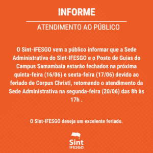 O Sint-IFESGO vem a público informar que a Sede Administrativa do Sint-IFESGO e o Posto de Guias do Campus Samambaia estarão fechados na próxima quinta-feira (16/06) e sexta-feira (17/06) devido ao feriado de Corpus Christi, retomando o atendimento da Sede Administrativa na segunda-feira (20/06) das 8h às 17h . O Sint-IFESGO