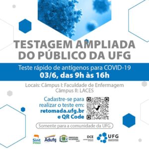 Nesta sexta-feira (03), a Faculdade de Enfermagem (FEN/UFG), em parceria com o Sint-IFESGO, Adufg Sindicato, Prefeitura de Goiânia e com o Diretório Central dos Estudantes (DCE), está realizando testagem ampliada para Covid-19 para a comunidade da Universidade Federal de Goiás. Os testes são feitos até as 16h na Faculdade de Enfermagem,
