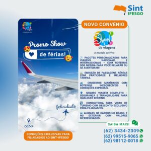 Férias chegando? O SINT-IFESGO te leva mais longe – com economia e segurança! O período de férias é o momento ideal para descansar, recarregar as energias e criar novas memórias. Pensando nisso, o SINT-IFESGO firmou um novo convênio com a Agência Show de Viagens, oferecendo descontos especiais, pacotes personalizados e até seguro