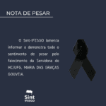O Sint-IFESGO lamenta informar e demonstra todo o sentimento de pesar pelo falecimento da Servidora do HC/UFG, MARIA DAS GRAÇAS GOUVEIA. O velório teve inicio