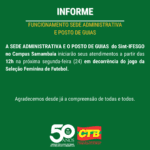 A Sede Administrativa Sint-IFESGO e o Posto de Guias do Campus Samambaia iniciarão seus atendimentos a partir das 12h na próxima segunda-feira (24) em decorrência
