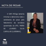 O SINT-IFESgo lamenta informar e demonstra todo o sentimento de pesar pelo falecimento da servidora aposentada da UFG, MARIA DE LOURDES SILVA CARVALHO (LURDINHA).
