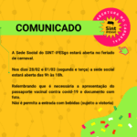 A Sede Social do SINT-IFESgo estará aberta no feriado de carnaval. Nos dias 28/02 e 01/03 (segunda e terça) a sede social estará aberta das