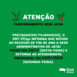 ATENÇÃO FUNCIONAMENTO SEDE JATAI Prezadas(os) filiadas(os), o SINT-IFESgo informa que devido ao recesso de fim de ano a Sede Administrativa de Jatai fecha dia 24/12