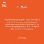 O SINT-IFESgo informa que a partir do dia 3 (quarta-feira) retoma suas atividades em horário comercial, das 8h às 17h seguindo todas as normas de