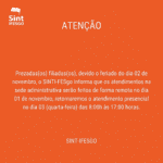 Prezadas(os) filiadas(os), devido o feriado do dia 02 de novembro, o SINTI-FESgo informa que os atendimentos na sede administrativa serão feitos de forma remota no