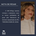 O SINT-IFESgo lamenta informar e demonstra todos os nossos sentimentos de pesar pelo falecimento da Servidora Aposentada da UFG, TEREZINHA MARIA DE JESUS.