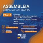 ASSEMBLEIA GERAL DA CATEGORIA DISCUTIRÁ NEGOCIAÇÕES E EDITAL PARA AS PRÓXIMAS ELEIÇÕES SINDICAIS