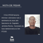 O Sint-IFESGO lamenta informar e demonstra todo o sentimento de pesar pelo falecimento de Reginaldo Jerônimo Pereira, funcionário da Sede Administrativa do Sint-IFESGO.